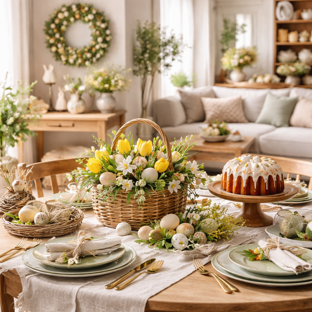 Pour le salon, les centres de table peuvent être déclinés sur une console ou une table basse : un plateau en bois, quelques bougies et un petit vase d’œufs décoratifs suffisent. Jouez sur les textures — velours, lin, osier — pour apporter de la profondeur et du réconfort visuel. La superposition des textiles transforme instantanément un espace et le rend plus propice aux conversations calmes et aux retrouvailles.