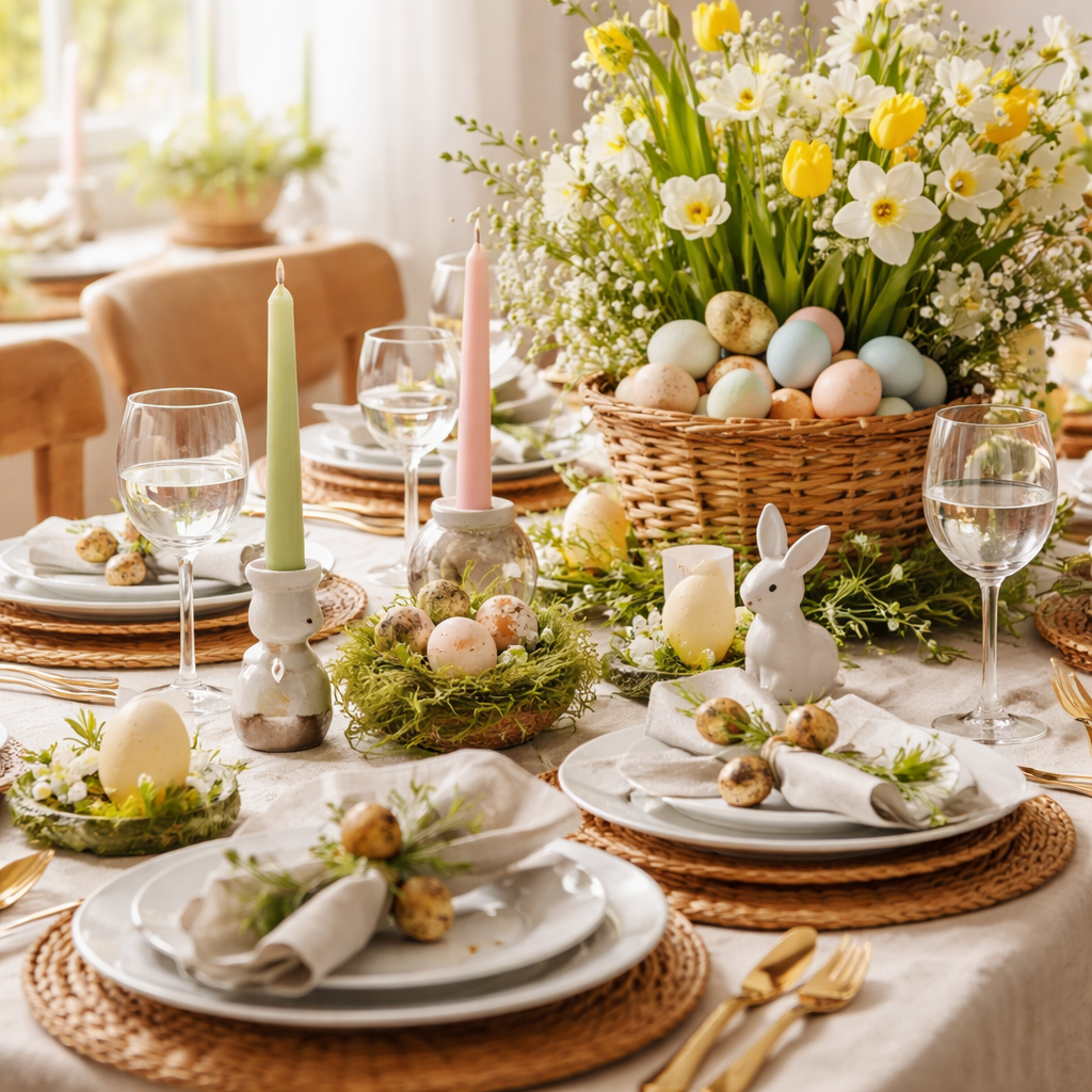 Le centre de table reste le point focal : pensez modulable. Un plateau en bois, quelques vases bas et des éléments interchangeables (oeufs peints, branches, petits bouquets) vous permettent de transformer l’ambiance en quelques minutes. Pour une famille qui aime les traditions, gardez un objet « témoin » que vous rajoutez au centre chaque année — cela crée une narration émotionnelle facile à partager.