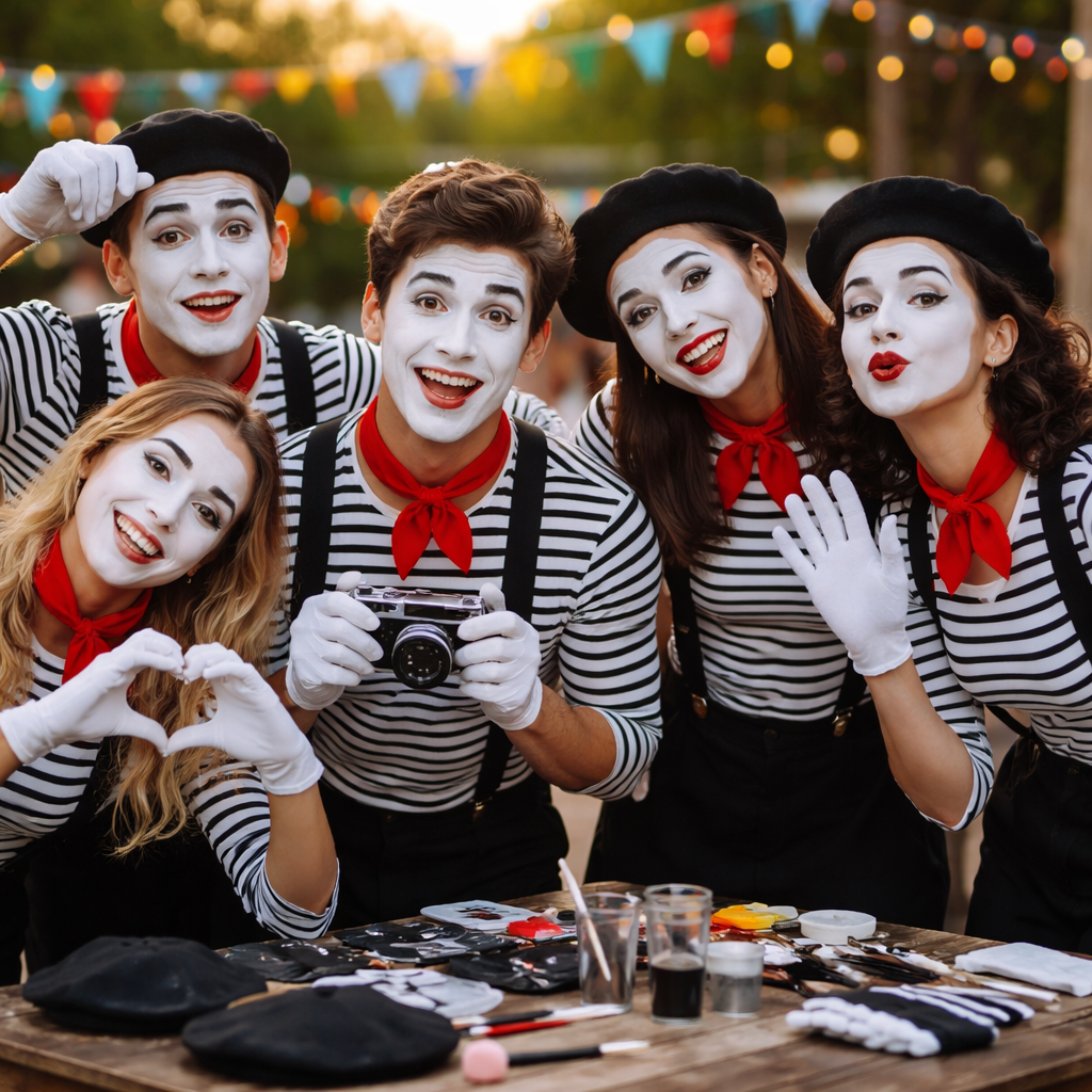 Pour les photos, pensez en termes d’avant/après émotionnel : organisez une série où l’on voit d’abord les participantes dans leur tenue quotidienne, puis la transformation en mimes — ces images racontent une histoire et fonctionnent très bien sur Pinterest. Sur scène, quelques saynètes courtes (30 à 60 secondes) créent des moments mémorables sans exiger une répétition intensive.