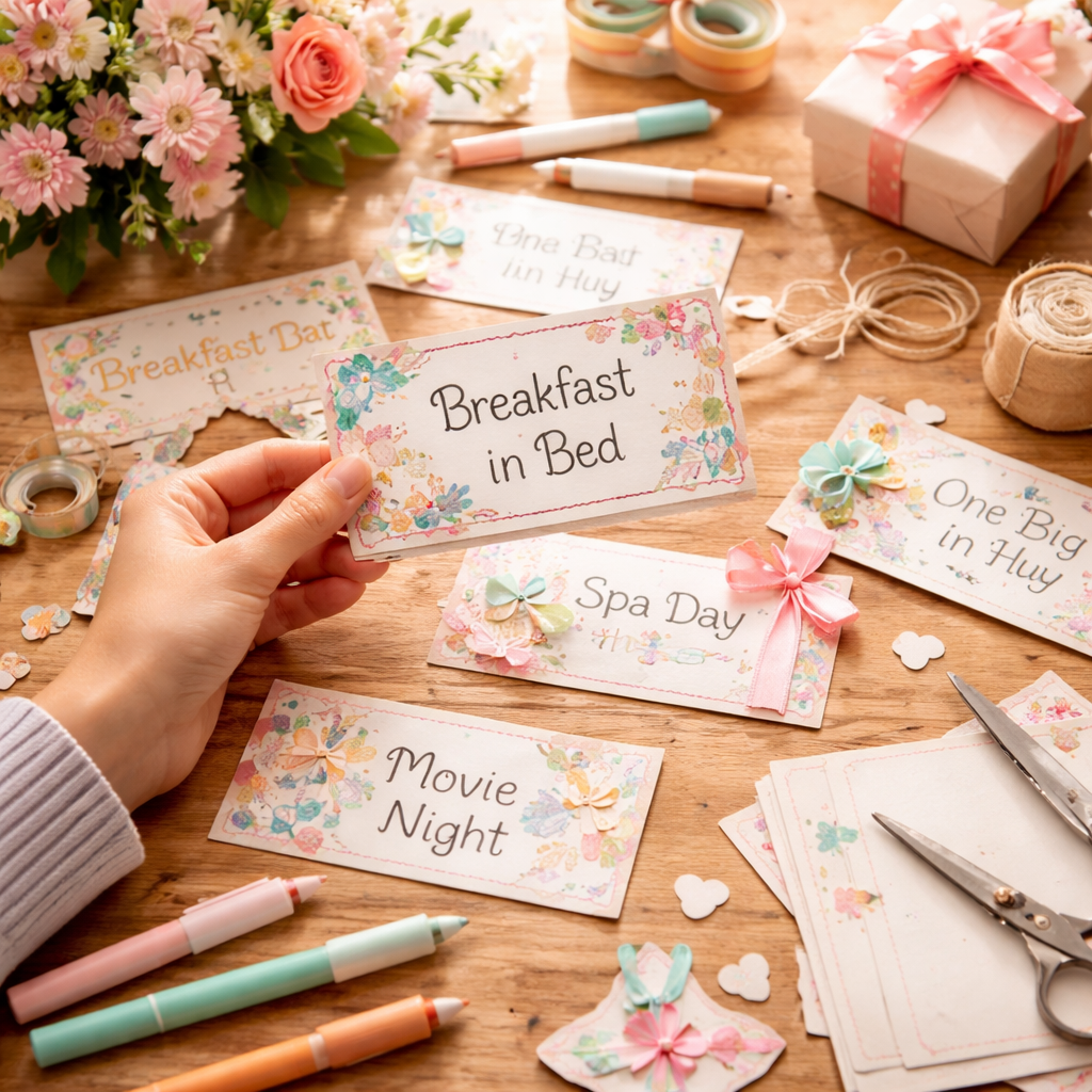 Variez le format : mini-carnet de bons, coupon unique dans une jolie enveloppe, ou armoire de bons attachée par un ruban. La présentation renforce l’émotion — glissez un petit mot doux, une photo Polaroid ou une fleur séchée pour personnaliser chaque coupon.