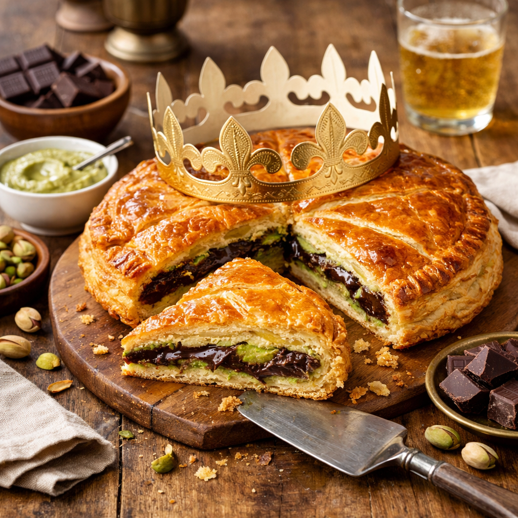 La cuisson doit être surveillée : une fournée à chaleur bien répartie, autour de 200–210 °C selon votre appareil, permet d’obtenir un feuilletage doré et une garniture cuite sans dessèchement. Laissez reposer la galette quelques minutes hors du four pour que la pâte se stabilise. En finition, un peu de chocolat râpé ou quelques éclats de pistache apportent du croquant et soulignent l’équilibre recherché entre rondeur et finesse.