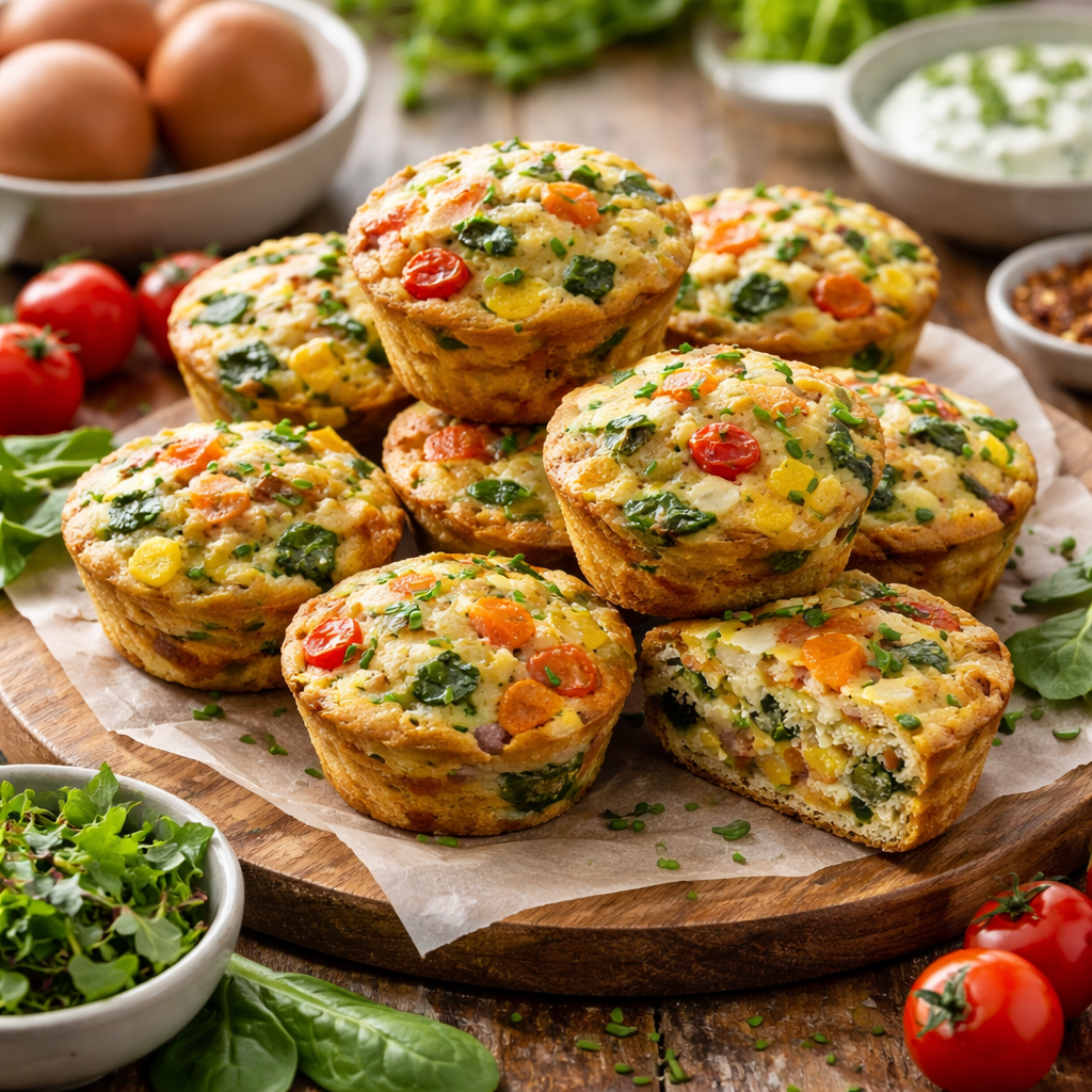 Servez les muffins tièdes, accompagnés d’une salade de jeunes pousses, d’avocat tranché ou d’une cuillerée de yaourt végétal pour un contraste crémeux. Pour un brunch convivial, disposez-les sur un plat avec herbes fraîches, petites tomates cerises et une sauce légère au yaourt citronné : l’assiette est belle et nourrissante.