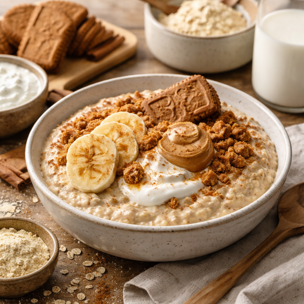 Un porridge enrichi en protéines combine la douceur réconfortante des épices spéculoos avec des éléments qui aident à tenir jusqu’au déjeuner. Au-delà du goût, il s’agit d’un petit‑déjeuner qui soutient la sensation de satiété, apaise le stress matinal et permet de retrouver une forme de calme intérieur avant d’attaquer la journée.