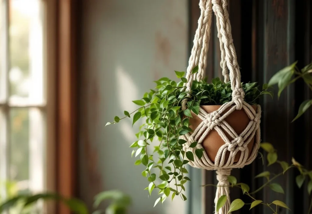 Le modèle classique à quatre brins est parfait pour les débutants : il convient à toutes sortes de pots et ne demande qu’un minimum de matériel nécessaire. Sa structure simple repose sur un anneau en bois et plusieurs longueurs de corde macramé nouées autour du pot. Quelques nœuds plats ou torsades suffisent pour lui donner du relief. Cette version trouve facilement sa place près d’une fenêtre ou dans un coin lumineux du salon.