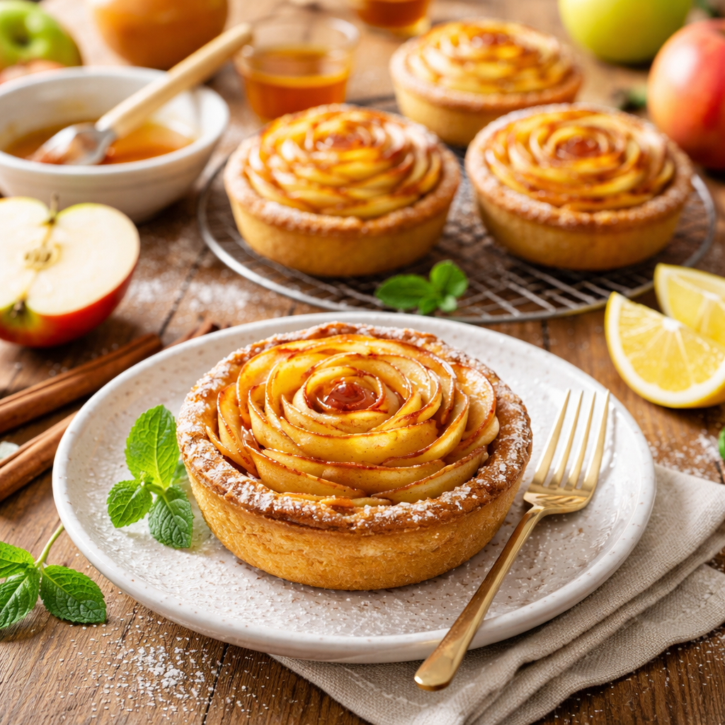 La tartelette en forme de fleur capte d’abord le regard : elle raconte une attention portée aux détails, comme un geste affectueux posé sur la table. Visuellement, les lamelles de pommes qui s’épanouissent sur un disque de pâte créent un contraste apaisant entre le doré et le caramel, une invitation à la dégustation qui touche autant l’œil que le palais.